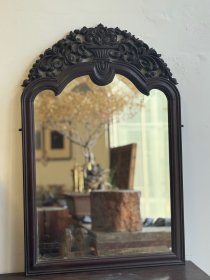 老红木镜子,老挝大红酸枝料,镜子是随型大磨边玻璃砖,明国时期老物件,顶部镂空雕花,年代感十足,可以正常使用,尺寸52/80/2.5厘米
