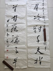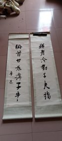 (卖家保真)伦杰贤,辽宁名家,历任中国书法家协会常务理事,中国书法家协会行书委员会副主任、辽宁省书法家协会副主席,大连市书法家协会主席,鲁迅美术学院特聘教授,大连画院专职画家,辽宁金州人。该对联作品创作与90年代。,画心尺寸135×31厘米×2作品原装原裱立轴手绘,品相和图片一致