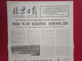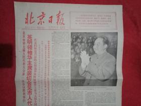 1977年12月15日《北京日报》(四开四版,头版套红;报眼为:“华主席语录:一定要选好革命委员会”;头版头条《华主席会见北京市人大代表》图文;北京市革命委员会委员名单;粉碎四人帮后的北京市第一次高考文化考试结束;通讯《考场见闻》;通讯《介绍青年厨师程明生的事迹》;《向四人帮讨还青春》专栏;武建军的刊头画《革命接班人》)