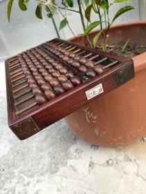 民国时期红木老算盘,四角包铁,骨架包铜,缺底板,非常老,九档算盘,两边是各两个铁钎子,中间五个是竹子的,有磕碰磨损破损等岁月痕迹。重1斤,木材质不详,购者自鉴。