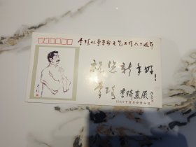 李琦从事革命文艺工作六十周年信封,内装李琦肖像画页。封皮“祝您新年好,李琦”几个字是李琦教授亲笔写的,其他的字都是印刷品。保真。李琦,中国美术家协会会员,中央美术学院教授。1988年离休。1991年起享受国务院特殊津贴,著名伟人画大师,文化部高级职称评审委员。 李琦以人物画见长,其肖像画融汇了中国画浑然天成的笔墨气韵和西洋画的立体、色彩技法,独树一帜,在新中国美术史上产生过重要影响。