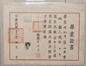 (一个人的,吴正沂)民国政府中央储备银行职员证,南京市立第二中学学生证,民国34年霍乱预防注射证,毕业证书,中决储备银行派令一张,收条一份[证6]
