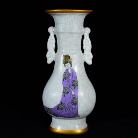 宋官窑刻诗加彩美女图双耳瓶