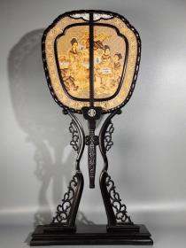 檀木镶嵌沉香木精工雕双面工 美女图 香扇屏风摆件 高62厘米 宽30.5厘米,重886克650