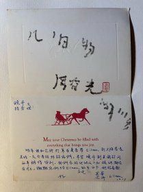 中国著名语言学家『汉语拼音之父』周有光签名钤印并题字 美国出品之圣诞贺卡一张:“儿旧物 周有光 时年111岁”,钤朱文印:“有光”。贺卡下部有友人英华一家三口写给 周有光之子,著名气象学家、中国科学院大气物理研究所研究员 周晓平及其夫人的短信,来源清晰可靠。