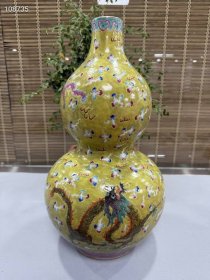 282_清晚期同光时期粉彩黄釉打底龙纹葫芦瓶.高度43公分.1