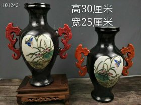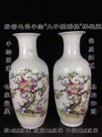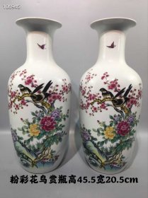 100_粉彩花鸟赏瓶一对,纯手工绘画,画工精细,器型独特,品相完整1