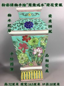 423_粉彩绿釉手绘“鸳鸯戏水”赏瓶,釉水肥厚,瓷质细腻。手绘图案,品相一流1