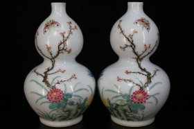 瓷器,老窑瓷,官窑,乾隆粉彩花卉虫草纹葫芦瓶一对 宽11厘米高18厘米 编号21100k215008