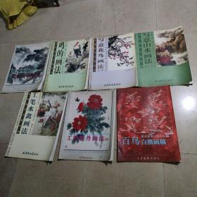 美术教学示范作品:写意山水画法、鸡的画法、写意花鸟画法(二)、写意山水画法(二)、工笔水禽画法、工笔牡丹画法(2)、百鸟白描画稿,共7册合售。4开本