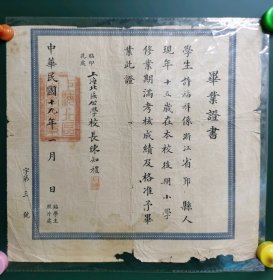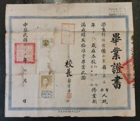 民国五年(1916) 时任嘉兴女子师范学校校长方英 签发致蒋-振-亚 毕业证书 一张(并贴有民国2分印花税票十五枚,钤印:方英、嘉兴女子师范学校钤记、浙江民政厅印)HXTX404194
