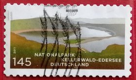 德国邮票 2011年 凯勒瓦尔德国家公园 埃德湖风光 1全信销 位于德国黑森州,埃德湖是黑森州最大的储水湖,周围环绕着连绵起伏的是中欧现存最大的红山毛榉森林之一,湖上建有一座大坝,形成了一片蛇形水库,在干旱季节,湖水水位下降,湖床裸露,甚至呈现出类似草原的景象。栖息着多种珍稀野生动物,如欧洲野猫、猫头鹰、红鸢、石雕和白肩雕等。