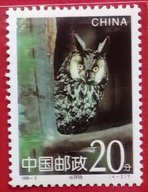 中国邮票 1995-5 长耳鸮 4-2 九品新票 古代对猫头鹰一类鸟的统称。现有鸮132种,我国有26种,其中体型最大者是雕鸮,常见的种类有长耳鸮、短耳鸮、仓鸮、草鸮、雪鸮。翅膀边缘锯齿状结构消除气流噪声,实现静音突袭。95%的食物是鼠类,间或捕食小鸟或大型昆虫。在大部分地区鸮被视为不吉利的鸟甚至叫它“报丧鸟”。国家二级重点保护野生动物。270°颈部旋转:颈椎14节(人类仅7节)实现“扭头不转身”
