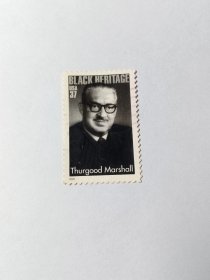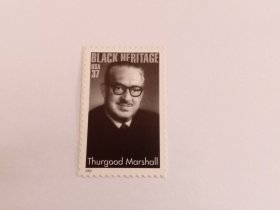 美国邮票 37c 2003年黑人遗产 美国最高法院大法官瑟古德·马歇尔 第一位担任美国最高法院大法官的非裔美国人。瑟古德·马歇尔1908-1993是美国20世纪的一位英雄:他承接并胜诉的"布朗诉教育委员会案"导致美国废除了种族隔离法。成为美国最高法院法官后,始终致力于增进包括少数族裔、妇女和移民在内的全体美国人的权利