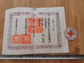 康德8年满洲赤十字社正赞助员会员证书带大号铝牌章 民国纸品收藏