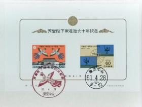 日本首日封:1986年日本发行《昭和天皇在位60周年纪念》小型张首日封(盖“凤凰·东京中央”纪念邮戳、“东京中央”邮政邮戳)