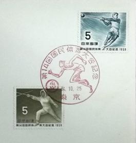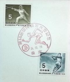 日本首日封:国民体育大会系列1959年发行《第14届国体纪念 - 击剑·链球》首日封(盖“赛跑·东京”纪念邮戳)N-3900