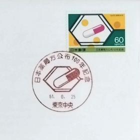 日本首日封:1986年日本发行《纪念日本药典法颁布100周年》首日封(盖“构造式胶囊和药片·东京中央”纪念邮戳)N-6644