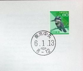 日本首日封:日本普通邮票系列(平成)1994发行《日本自然系列 - 冠鱼狗(面值80)》首日封(盖“东京中央”邮政邮戳)N-4483