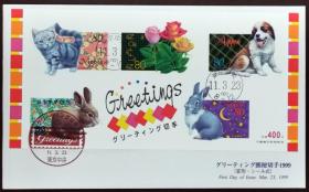 日本首日封:1999年日本发行贺礼系列《小猫、玫瑰、小狗、兔子》変形邮票首日封(盖“问候系列·东京中央”纪念邮戳、“东京中央”邮政邮戳)