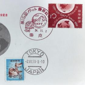 日本首日封:1959年日本发行《关贸总协定(GATT)第15届东京大会》首日封(盖“富士山、菊花”纪念邮戳、“东京(罗马文)邮政邮戳)