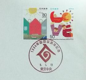 日本首日封:1994年日本发行《国际家庭年 - 家に咲く家族、LOVE (ラブ)》首日封(盖“国际家庭年·东京中央”纪念邮戳)
