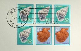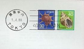 日本首日封:日本普通邮票系列1988年发行《贝壳系列 - 巴贝(面值60)、星螺(面值40)》首日封(盖“东京中央”邮政邮戳)