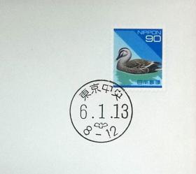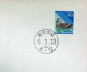 日本首日封:日本普通邮票系列(平成)1994发行《日本自然系列 - 印度斑嘴鸭(面值90)》首日封(盖“东京中央”邮政邮戳)N-4484