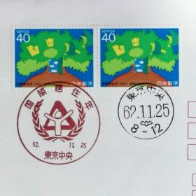日本首日封:1987年日本发行《国际住房年 - 大樹と家族》双联首日封(盖“国际住房年·东京中央”纪念邮戳、“东京中央”邮政邮戳)