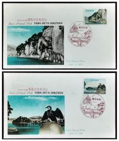 日本首日封:国定公园(国定公園)系列1959年发行《耶馬日田英彦山》邮票首日封共2枚全(盖“东京中央”纪念邮戳)