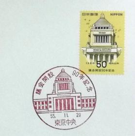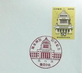 日本首日封:1980年日本发行《议会开设90周年》首日封(盖“国会议事厅·东京中央”纪念邮戳)