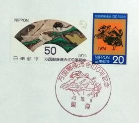 日本首日封:1974年日本发行《纪念万国邮联100周年》首日封(盖“UPU記念碑·东京”纪念邮戳)