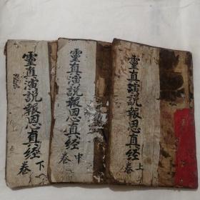 W43,孔网孤本,少见四川宗教古籍,清同治4年四川泸州蓝田场宝珠山精写刻本:地藏血湖报恩宝忏,原装大开本线装3册上中下卷全,写刻精良,封皮有印章一枚,除一册上端有些破损不伤字外,品不错。