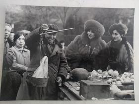 世家狐皮与貂皮 姬仙蒂婀名师设计 改革开放广告 照片 (迷人的中国模特披上姬仙蒂婀名师设计的世家貂皮和狐皮时装,漫步街头,又在水果摊前搭讪,引来了赞叹的目光)17.5-12.7cm
