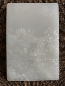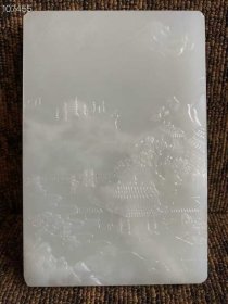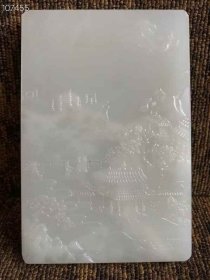 清代和田玉砚砖,镇纸,浮雕山水树木人家,亭台楼榭、山峦叠嶂,错落有致,路人寒暄,宛如仙境犹如置身世外桃源惹人向往,浮雕工艺,精美绝伦,精细精美精湛,不可多得之古艺术精品,器型规格硕大,保存完整!xjt