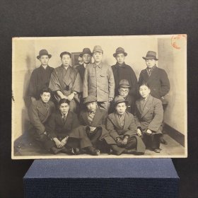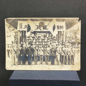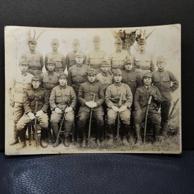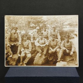 民国原版银盐老照片 侵华时期日军集体合影 人物均身着全套日军制式军装(含制式军帽、军装上衣、军裤、军靴等) 户外岩石与植被背景 日本军国主义扩张阶段实物影像 原版品相如图