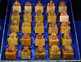 珍藏品 寿山石田黄石雕刻清代二十五古宝印章 色泽浓厚 材质细腻 红血丝明显 满汉印文 收藏佳品 落款:乙酉年【吴昌硕】作 单个尺寸:6x6x8厘米 净重:15千克