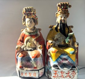 清晚期景德镇窑传世之作,玉皇大帝与王母娘娘瓷像一对,釉色温润如玉,衣袂翩然若生,寓意天地和谐,福寿双全。收藏价值历史文化意义深远重大。