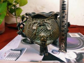民国时期铜香炉一个!大师之作!造型做工十分精美别致!三婴戏福袋!双如意炉耳!底款招财进宝!十分精美!十分有童趣!传世之作!收藏佳品!重三斤左右!