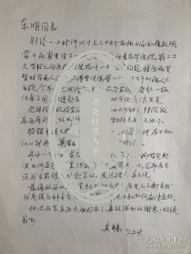 谭其骧致吕东明信札1页无封。谭其骧(1911年2月25日-1992年8月28日),字季龙,浙江嘉善人,中国历史学家、历史地理学家。1930年毕业于暨南大学历史社会学系,。1932年获燕京大学研究院硕士学位。1980年当选为中国科学院学部委员(院士)。曾任复旦大学教授、历史系主任,中国历史地理研究所所长。中国历史地理学科主要奠基人和开拓者。主要著作有《长水集》《长水集续编》等。