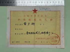 公私合营中药业. 私股股金核定证(中国药材公司上海市公司,黄浦区. 国药业. 迩遐斋.雷少衡)