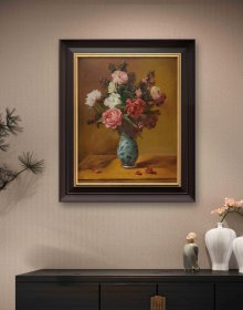手绘花卉油画作品 【尺寸】50*40cm 【说明】临摹作品,画面中央是一瓶蓝色花纹瓷瓶,瓶中插满粉色、白色、红色玫瑰,搭配绿叶点缀,色彩丰富层次分明。背景为暖色调,与前景形成对比,突出主体。瓶身花纹精致,笔触细腻,整体构图和谐。