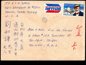 [K2-71]美国德克萨斯州达拉斯王冉之/理璜致台北刘和谦(安徽肥东人/海军一级上将)兄嫂贺卡:新年快乐健康成功/贴美国天文学家、航空先驱塞缪尔·皮尔庞特·兰利45美分邮票未销/台湾中山到达邮戳不清,14.5X21厘米双折。