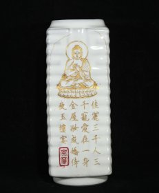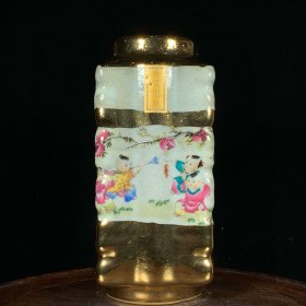 宋官窑加彩鎏金花鸟婴戏纹琮式瓶,高23直径10cm