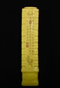 大周柴窑黄釉刻字描金题诗纹琮式瓶,高40×9.5厘米