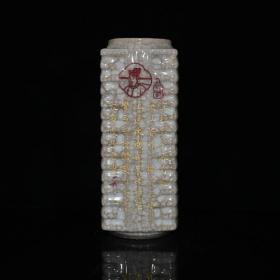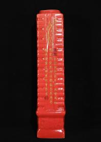 大周柴窑红釉刻字描金琮式瓶,高40×9.5厘米