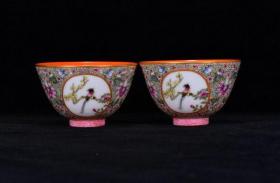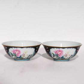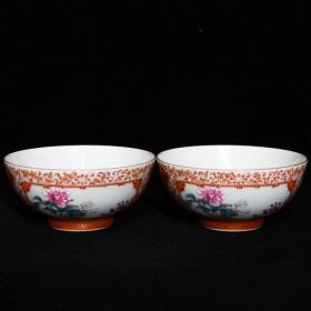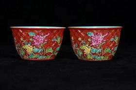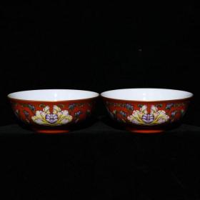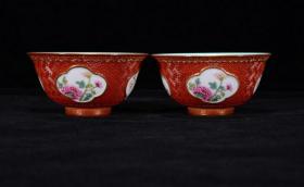 清官窑外胭脂红内珐琅彩折枝花卉碗一对
