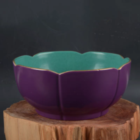 清官窑茄皮紫釉花卉纹葵口碗