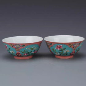 清官窑粉彩开窗四季花卉纹碗一对