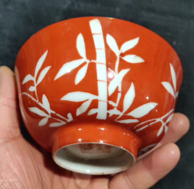 清官窑红釉竹子纹碗
